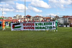 Tekirdağ Süper Amatör Lig’de Taşkıranlar Kapaklı 59 Spor futbolcuları, Akçeşme Spor karşılaşmasına ‘Kudüs Kıbledir, Kudüs Miraçtır’ yazılı pankartla çıkarak Filistin’e destek verdiler. Maçta Taşkıranlar Kapaklı 59 Spor, rakibini 4-1 mağlup etti.