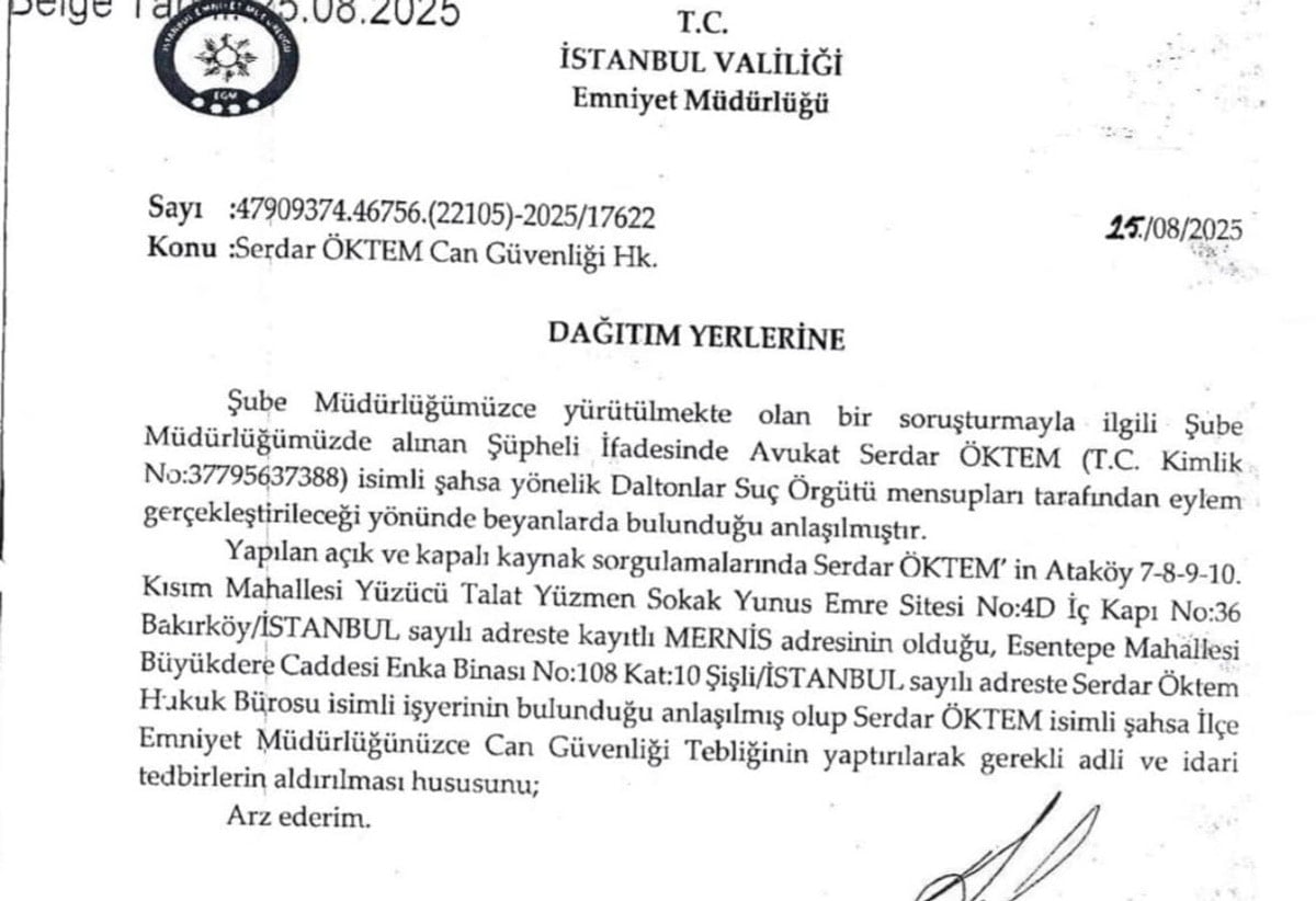 İstanbul Zincirlikuyu’da aracında çapraz ateşe tutularak öldürülen avukat Serdar Öktem’e 1.5 ay önce tebligat yapıldığı, suikast ihbarında bulunulduğu ortaya çıktı. Öktem’e çağrı üzerine koruma verildiği, avukatın yakın koruma da talep ettiği, valiliğin toplanıp karar alma sürecindeyken cinayetin işlendiği de belirlendi.