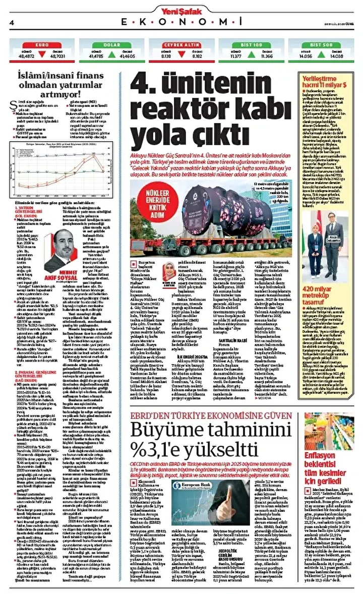 Akkuyu Nükleer Güç Santrali’nin 4. Ünitesi’ne ait reaktör kabı Moskova’dan yola çıktı. Türkiye’ye teslim edilmek üzere törenle uğurlanan ve üzerinde “Gelecek Yakında” yazan reaktör kabları yaklaşık üç hafta sonra Akkuyu’ya ulaşacak. Bu sevkiyatla birlikte tesisteki nükleer adalar son şeklini alacak.